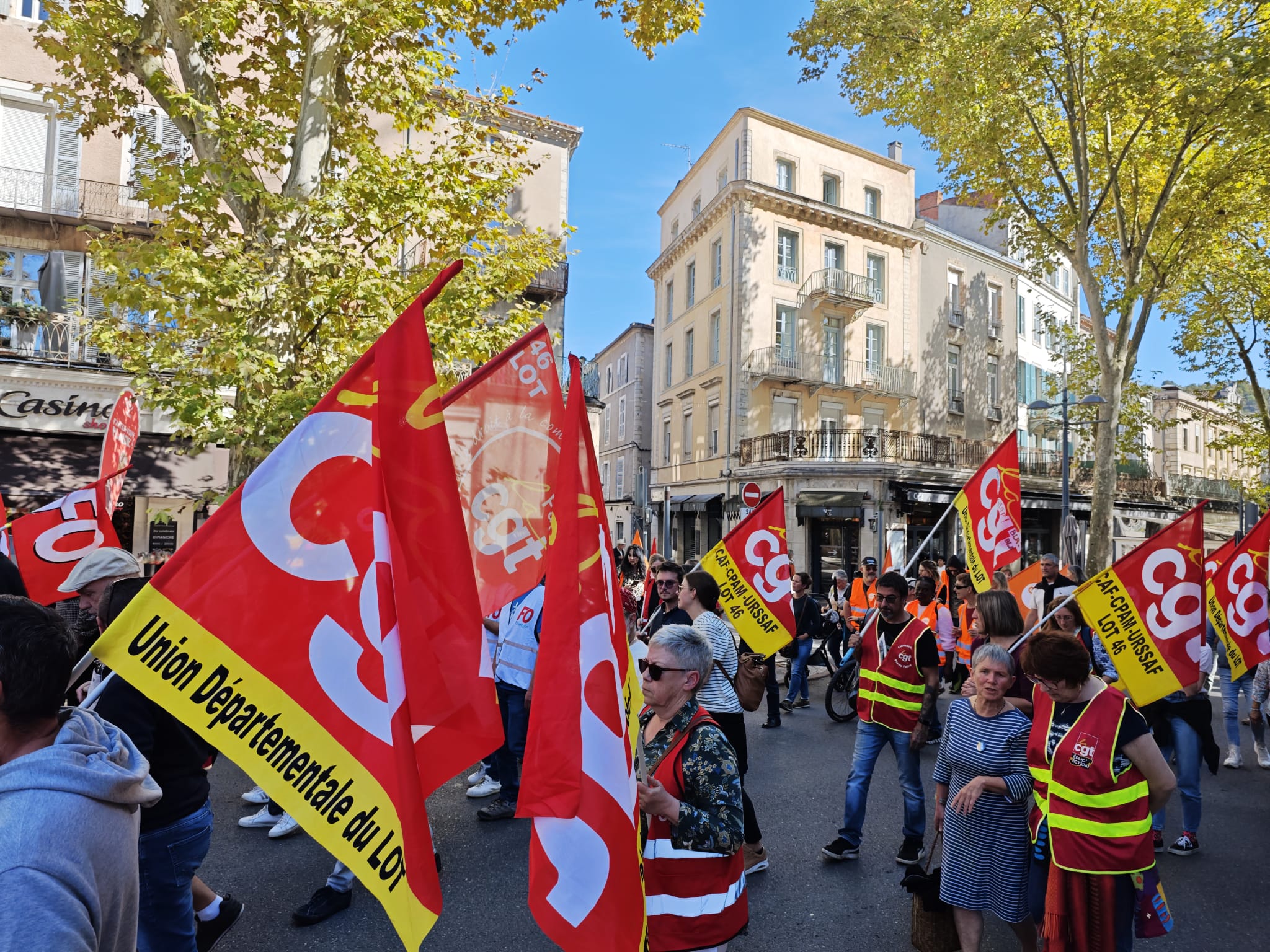 Le 2 octobre se sont près de 600.000 manifestant·es dans 250 manifestations qui ont battu le pavé à travers le pays à l’appel de l’intersyndicale. La CGT recense des mouvements de grèves importants dans plusieurs secteurs, dont la chimie, les organismes sociaux, la fonction publique territoriale, l’éducation. Dans le Lot avec plus de 20 appels à faire grève dans les entreprises et services, les 3 rassemblements ont réuni 1200 personnes ce 2 octobre, 3e journée de mobilisation contre l’austérité.