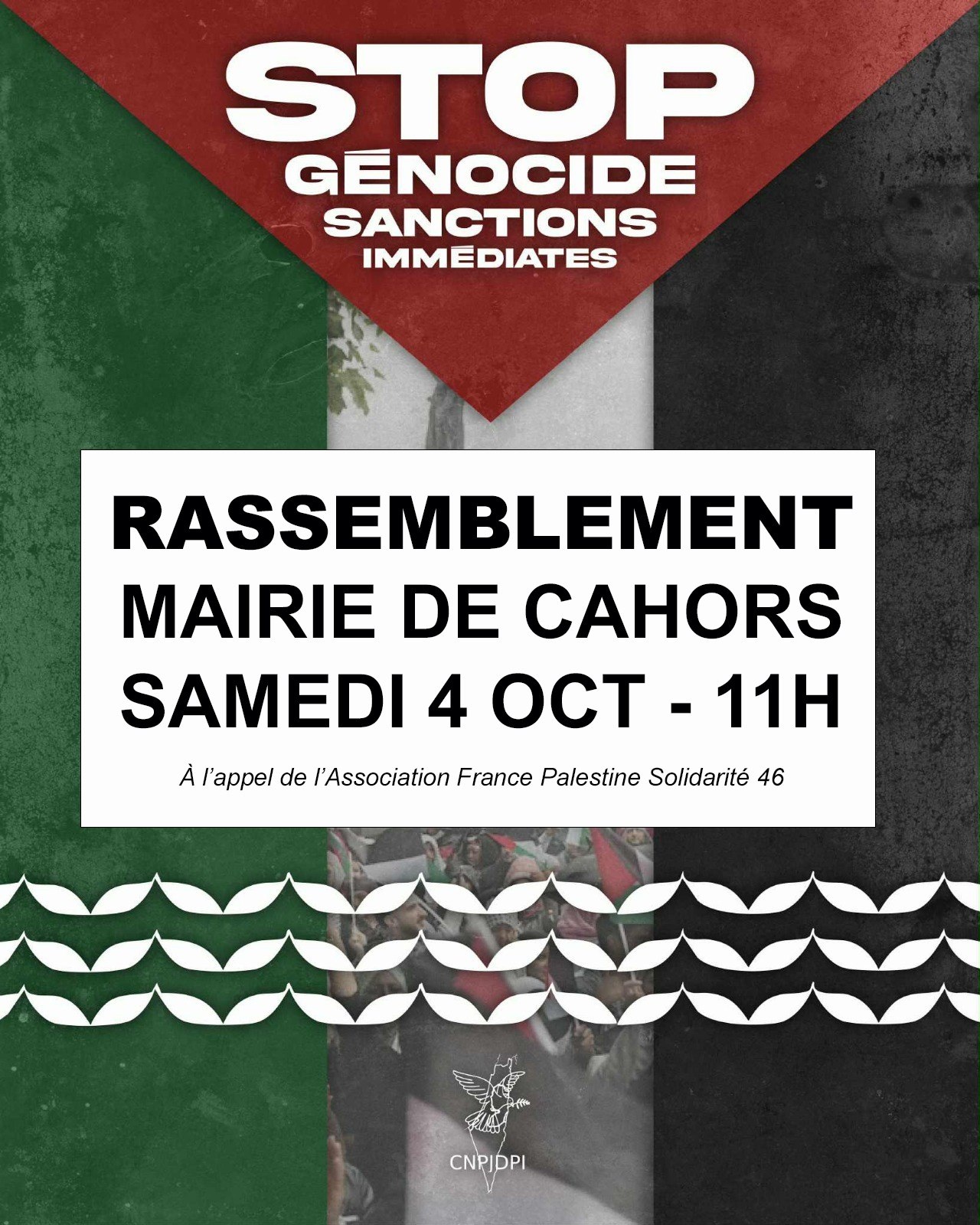La CGT du Lot appelle à se joindre au rassemblement à 11h00 sur le parvis de la mairie de Cahors organisé par l’AFPS46 sur la base du texte du Collectif National pour une Paix Juste et Durable entre Palestiniens et Israéliens (cnpjdpi) dont la CGT est signataire.